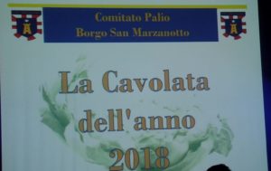 L’ambiente del Palio di Asti è fatto di tanti momenti ufficiali seri e importanti ma anche di occasioni goliardiche, nate spesso dall’esigenza di finanziare le attività principali dei partecipanti. Tra questi momenti goliardici ci sono le cene che permettono di far conoscere l’attività dei vari Rioni e Borghi e di raccogliere fondi per arrivare pronti alle Sfilate e al Palio di settembre. Il Comitato Palio di Borgo San Marzanotto ha voluto aggiungere qualcosa in più ad una delle sue cene, creando un “trofeo” fuori programma da assegnare a chi ha preso la cantonata più clamorosa durante l’edizione del Palio precedente. E’ nata così la “Cena del Cavolo”, con menu rigorosamente a base di cavolo, dove ovviamente è l’ortaggio il trofeo per chi ha commesso la “cavolata” dell’anno. Lo scorso anno il “Cavolo” fu assegnato al “Mossiere” del Palio, Giancarlo Matteucci, rivelatosi non proprio impeccabile nel suo ruolo.