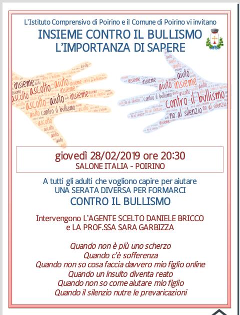 Poirino, una serata “Insieme contro il bullismo. L’importanza di sapere” 🗓 di Redazione · 26 Febbraio 2019 Visto da: 66 28 Febbraio 2019 Scheduled POIRINO CARMAGNOLA VILLASTELLONE CARIGNANO