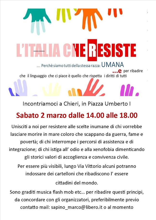 Chieri: ‘L’Italia che resiste’, sabato 2 marzo in Piazza Umberto