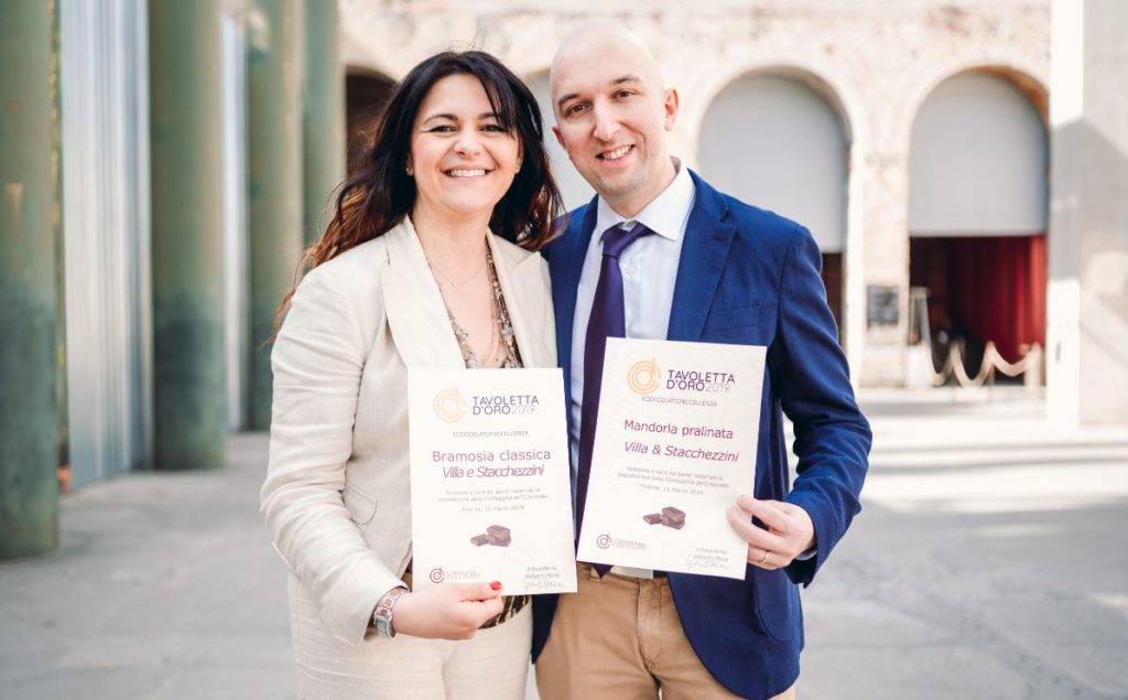 Il rivese Massimo Villa Si riconferma con la moglie Carola Stacchezzini tra i Big del Cioccolato raddoppiando i trofei all’ambito Premio TAVOLETTA D’ORO giunto alla 17° edizione che quest’anno si è svolto al Taste di Firenze, il salone dedicato alle eccellenze del gusto e del food lifestyle. “Siamo stati già premiati alla 15° edizione per la Pralina Marzapane Arance e Fave di Cacao anche se il premio più grande lo abbiamo vinto non partecipando alla scorsa edizione perché intenti a creare Matilde che oggi ha un anno, alla quale dedichiamo ogni cosa”, racconta il Maestro Pasticciere Massimo Villa che da 13 anni vive a Faenza e dove nel 2013, ha dato vita al Laboratorio del cioccolato artigianale insieme alla moglie Carola Stacchezzini. La passione per la pasticceria Massimo la ha sin da piccolo quando con l’aiuto della zia, preparava torte per tutti, in particolare una squisita crostata da gustare in famiglia per le ricorrenze speciali o da condividere con gli amici all’oratorio di Riva ai tempi di Don Vico Cavallo. Appoggiato dalla famiglia quindi, segue la sua passione e si diploma alla scuola di arte bianca di Torino, inizia poi a lavorare in una pasticceria di Chieri ma, spinto dalla gran voglia di ampliare i suoi orizzonti si trasferisce presto a Sottomarina di Chioggia per entrare a fare parte del prestigioso Istituto Superiore delle Arti culinarie Etolie dove, ha la possibilità di affiancare importanti maestri, che gli aprono altri nuovi orizzonti, per cui si sposta a Londra per lavorare al Four Seasons Hotel Canary Wharf nella brigata di pasticceria internazionale a 5 stelle, per tornare dopo pochi anni lui stesso come docente nel prestigioso istituto Veneto. Continua in Italia la sua avventura negli Hotel Stellati divenendo presto il capo pasticciere all’hotel Palace di Milano Marittima, non smette mai nonostante l’intenso lavoro di dedicarsi alla ricerca e allo sviluppo di nuovi ingredienti, tecniche e ricette, ”la conoscenza delle materie prime, dice Villa, e della tecnologia nell’attrezzatura sempre rinnovata è essenziale per potere dare vita a indimenticabili ricette che combinano tra loro materie prime selezionate.” Nel 2012 è coautore del Libro Nuovi Classici #2 Cakes, pubblicazione dedicata ai dolci da forno con ben 60 ricette tra le quali alcune rivisitate di prelibate torte che creava nella cucina di Riva da ragazzino per deliziare amici e parenti. E’ con questo spirito di ricerca costante che con la moglie Carola Stacchezzini, esperta cioccolatiera, approdano velocemente tra i Big del cioccolato aggiudicandosi premi sin dalla prima partecipazione. “Le Tavolette d’Oro sono gli Oscar del cioccolato italiano di qualità, ci spiega Villa, e tra i novecento tipi di prodotti in cioccolato in concorso (dragées, cremini, giandujotti, creme spalmabili, canditi e frutte ricoperte, praline ecc), il Laboratorio del Cioccolato Villa & Stacchezzini ha conquistato ben due premi in questa edizione, ci siamo presentati per la categoria Praline con Mandorla Pralinata e per la categoria Creme Spalmabili con Bramosia Classica affiancandoci a nomi del calibro di Amedei, Domori, Slitti, Gobino…” Lunedì 11 Marzo, all’interno dello spazio al Teatro dell’Opera di Firenze, tra i protagonisti del mondo del cioccolato i Maestri Carola Stacchezzini e Massimo Villa, hanno così o ritirato con grande soddisfazione i loro premi. “Nel nostro laboratorio – ci racconta Massimo – abbiamo unito competenza e passione per mettere a disposizione delle migliori pasticcerie gelaterie e attività della ristorazione e somministrazione in genere, le nostre creazioni artigianali e le nostre capacità, in questi giorni stiamo preparando la Pasqua, creando uova e bellissimi soggetti per tutti i gusti, poi continueremo il nostro lavoro progettando il Catalogo per la prossima stagione.”