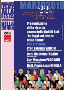 Il 22 marzo all’Università di Asti sarà presentata una ricerca della Cgil su tutte le leggi sul lavoro delle donne, dagli inizi del ‘900 ad oggi. Saranno presenti la docente universitaria Fabrizia Santini, la ricercatrice Nicoletta Fasano dell’Istituto della Resistenza e l’avvocato giuslavorista Massimo Padovani e la consulente del lavoro Francesca Ginella.