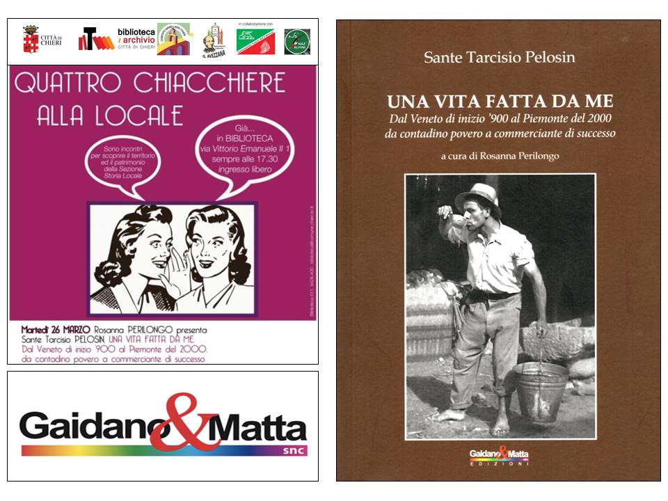 Martedi 26 marzo alle ore 17.30 in sala conferenze della Biblioteca Civica di Chieri, nell’ambito del progetto “Quattro chiacchiere alla locale”, Rosanna Perilongo presenta l’autobiografia di Sante Tarcisio Pelosin “Una vita fatta da me”, curata con la collaborazione di Luciano Genta e pubblicata da Gaidano&Matta.