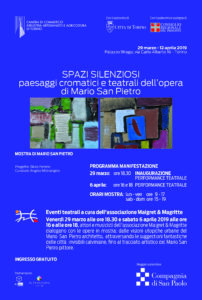 Torino, venerdì 29 marzo, alle ore 18.30, inaugurazione a Palazzo Birago, in via Carlo Alberto 16, della mostra «Spazi silenziosi: paesaggi cromatici e teatrali dell’opera di Mario San Pietro», progetto di Silvio Ferrero, esposizione a cura di Angelo Mistrangelo, con la collaborazione di Clara Passavanti. Contemporaneamente gli attori e musicisti dell’Associazione Maigret&Magritte