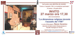 Conversazione con Monsignor Renzo Savarino, docente di Storia della Chiesa presso la Facoltà Teologica di Torino sul tema: “ La dimensione religiosa durante l’assedio del 1706”. L’incontro si svolge nell’ambito della prima delle Mostre nel museo sul  tema “Torino e l’assedio 1706. La condizione spirituale” nell’occasione del 390° anniversario di nascita del Beato Sebastiano Valfrè (9 marzo 1629), che tanta parte ebbe all’epoca dell’assedio nell’assistenza alla popolazione assieme alla Beata Maria degli Angeli, per approfondire gli aspetti religiosi, di devozione, di assistenza e di solidarietà umana e spirituale svolta dalla Chiesa torinese in un momento significativo della vita di Torino e della sua popolazione.