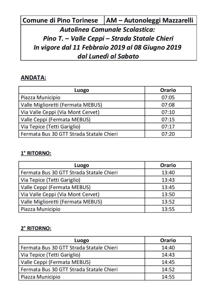 Il servizio di collegamento tra la frazione di Valle Ceppi e la linea 30, dopo la sospensione del servizio effettuato da Cavourese, verrà coperta grazie all’utilizzo dello Scuolabus. Il Comune di Pino Torinese ha infatti siglato un accordo con la Ditta AM Autonoleggi di Antonello Mazzarelli, che ha in gestione il trasporto scolastico.