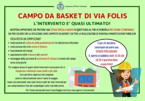 È in fase di ultimazione l’intervento di riqualificazione del campo da basket di via Folis, che ha visto una totale messa a nuovo di quest’area al fine di renderla più sicura e funzionale sia per coloro che la utilizzano come campetto da basket che per la realizzazione di eventuali manifestazioni pubbliche.