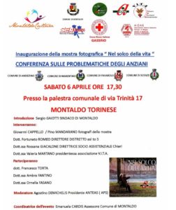 A Montaldo Torinese, una conferenza sulle problematiche degli anziani, in palestra, sabato 6 Aprile ore 17,30 con annessa mostra fotografica dal titolo “Nel solco della vita”. Introduce il Sindaco e partecipano tutte le associazioni di Montaldo ed i rappresentanti dei Comuni limitrofi.