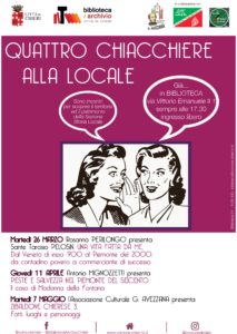 Giovedì 11 aprile, alle ore 17,30, presso la sala conferenze della Biblioteca Comunale, terzo incontro della serie: QUATTRO CHIACCHIERE ALLA LOCALE. Antonio Mignozzetti presenta il suo ultimo libro: “IL SANTUARIO DELLA MADONNA DELLA FONTANA, IN RIVA PRESSO CHIERI”, con un excursus sul Seicento e sulla peste in Europa, a Torino, a Chieri, a Riva presso Chieri.