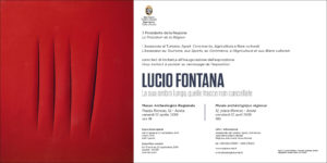 L’Assessorato del Turismo, Sport, Commercio, Agricoltura e Beni culturali della Regione autonoma Valle d’Aosta comunica che, venerdì 12 aprile 2019, alle ore 18, al Museo Archeologico Regionale di Aosta, verrà inaugurata la mostra Lucio Fontana. La sua ombra lunga, quelle tracce non cancellatea cura di Giovanni Granzotto e Leonardo Conti. L’esposizione si propone di evidenziare, in un periodo compreso tra la fine degli anni quaranta e il 1968, quelle tematiche che più hanno rappresentato un nuovo modo di concepire l’arte di Lucio Fontana, partendo da un corpusrilevante di circa trenta opere dell’artista, tra tele, ceramiche e carte.