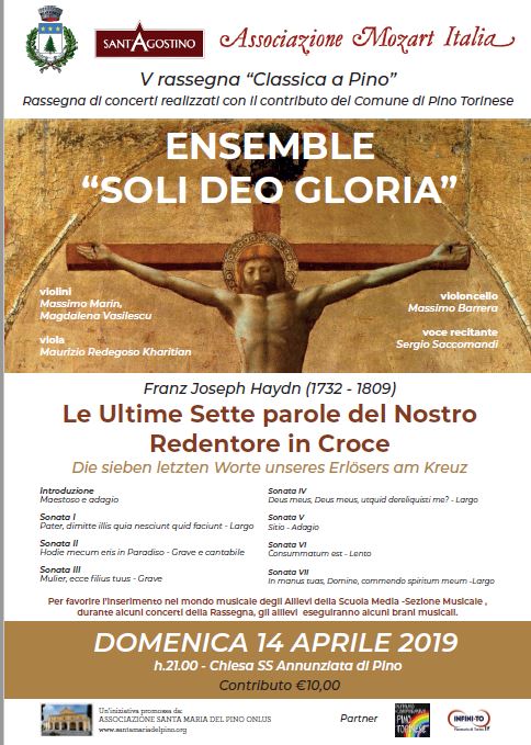 I Musicisti della ENSAMBLE SOLI DEO GLORIA, quartetto d’archi e voce recitante, eseguiranno Le Ultime Sette Parole di Cristo sulla Croce.