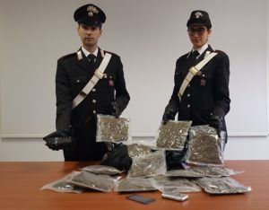 I Carabinieri del Nucleo Operativo e Radiomobile della Compagnia di Asti, nel corso di un’attività di polizia giudiziaria delegata dalla locale Procura della Repubblica volta alla ricerca di armi comuni da sparo, hanno arrestato un 17enne astigiano poiché all’interno della propria abitazione aveva occultato oltre un chilo e mezzo di sostanza stupefacente del tipo Marijuana. La droga, destinata perlopiù a soddisfare le richieste tra i giovanissimi della città, era custodita all’interno di un borsone da palestra, suddivisa in 14 sacchetti di plastica messi sotto vuoto, un originale metodo di confezionamento al fine di conservarne più a lungo la fragranza ed il principio attivo. All’interno dell’appartamento sono stati anche rinvenuti appunti manoscritti indicanti i crediti vantati nei confronti dei giovani clienti, un bilancino elettronico di precisione per la corretta preparazione delle dosi nonchè un taser modello “Stun Gun” , uno  storditore elettrico capace di trasmettere le scariche quando viene messo a contatto con il  corpo della vittima.
