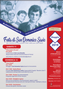 L’Associazione “La Casetta”, la Parrocchia di Riva presso Chieri e gli Amici di San Giovanni propongono un ricco calendario di appuntamenti ed iniziative in occasione dei festeggiamenti 2019 del giovane San Domenico Savio, presso casa natia. • Santo – 11 maggioOre 20.30 – “Ricercatori di Luce”Condivisione di Don Luca Ramello(Responsabile Pastorale Giovanile Diocesi di Torino)Testimonianza di Pierluigi Dovis(Direttore della Caritas Diocesi di Torino)Info presso Sr. Cristina Biasi: sr.cristinabiasi@yahoo.it • Domenica – 12 maggioOre 10.45 – “Farsi Santi”Omaggio a San Domenico Savio davanti al monumento Ore 11.00 – Santa MessaPresiede Don Gianfranco Laiolo (Responsabile Progetto “Bambini Liberi”)Celebrazione animata dalle corali della ParrocchiaOre 13.00 – Pranzo (su prenotazione)Preparato dagli amici di San GiovanniOre 14.30 – Famiglia in giocoMini torneo di pallavolo e di ping pong per ragazzi e adultiIntrattenimento Musicale del coro Free Spirit di Chieri – Raffaele Lo Buono Ore 16.30 – Conclusione Chiusura dei giochi, merenda e saluti