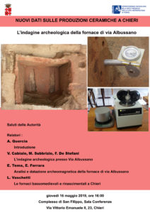 Sotto la direzione scientifica della Soprintendenza Archeologia, Belle Arti e Paesaggio della Città Metropolitana di Torino, alla fine del 2018, nel corso di uno scavo in un immobile privato (via Albussano 30) sono stati messi in luce i resti di una fornace postmedievale – probabilmente per laterizi – realizzata con pareti di argilla concotta. Per un puntuale inquadramento cronologico del manufatto, è stata eseguita un’analisi di archeomagnetismo attraverso il prelievo di campioni dalle pareti, grazie al contributo economico dell’Amministrazione Comunale. I risultati complessivi dello studio archeomagnetico e dello scavo archeologico verranno presentati alla cittadinanza il 16 maggio 2019, alle ore 16.00, nella Sala Conferenze del Complesso di San Filippo.