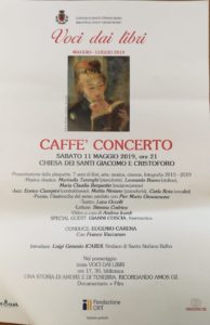 Sabato sera 11 maggio di musica, teatro, chiacchiere in libertà per un incontro dove cultura e leggerezza si sposano presso la chiesa dei Santi Giacomo e Cristoforo, auditorium della Fondazione Pavese, per una serata speciale che ha proposto la formula dei café-concert francesi con musica, canzoni, teatro, video, letture.Nel corso della serata è stata presentata la plaquette “7 anni di libri arte musica cinema fotografia 2013-2019”, omaggiata a tutti i partecipanti, nel giorno in cui inizia, con un ricordo dello scrittore israeliano Amos Oz, l’edizione maggio – giugno 2019 di VOCI DAI LIBRI.La serata è stata condotta da EUGENIO CARENA con la partecipazione di: