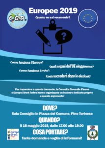 Si terrà dalle h. 17,00 alle 19,00 di giovedì 16 maggio presso la Sala del Consiglio Comunale una bella ed utile iniziativa promossa dalla Consulta Giovani di Pino Torinese. Come indicato nel volantino di invito molti i temi che si affronteranno per cercare di arrivare un po’ più preparati all’appuntamento delle prossime elezioni europee. L’evento è organizzato in collaborazione con “Europe Direct Torino”.