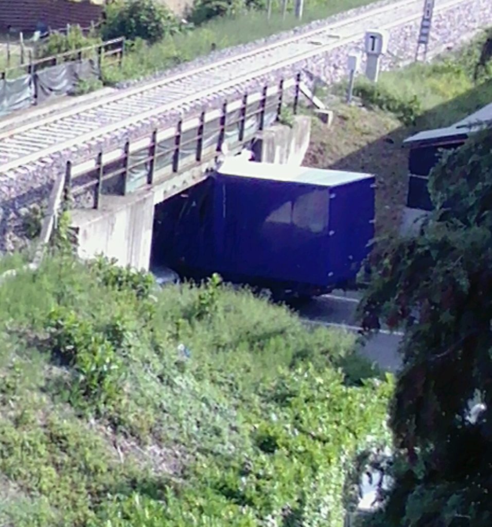 A Chieri, un camion, non certo il primo (e non sarà l’ultimo), si è incastrato sotto il ponte della ferrovia, in Strada Cambiano: la segnaletica è chiara, i dissuasori sono in bella vista, ma qualcuno ogni tanto sfida le più elementari leggi sulla imenetrabilità dei corpi… (foto di Maria Carla Graglia)