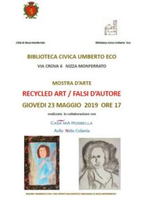 Giovedì 23 maggio, alle 17:00, nella Biblioteca civica Umberto Eco di Nizza Monferrato (Via Crova, 6) si terrà l’inaugurazione della mostra d’arte “Recycled Art / Falsi d’Autore” con cornici di opere realizzate con materiale di recupero e riproposizioni di alcune delle opere più conosciute della storia dell’arte.