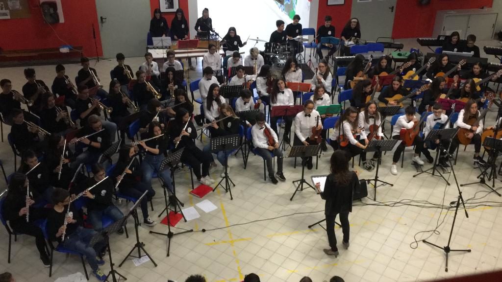 Nelle foto: durante il concerto del gemellaggio con Bari presso la scuola di martedì 14 maggio (orchestra “Manassi” di seconda e terza) e durante la premiazione al concorso di Ozegna di venerdì 17 maggio (orchestra classe prima).