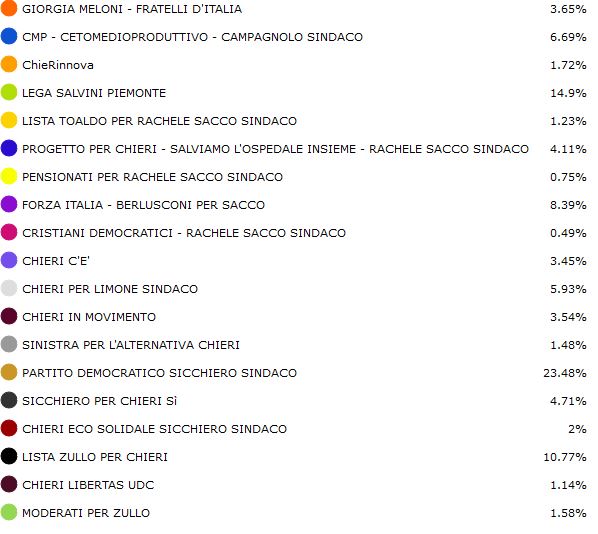 Ecco la tabella, pubblicata sul sito del Comune di Chieri, con i risultati percentuali delle 19 liste che hanno partecipato al 1° turno delle elezioni comunali chieresi