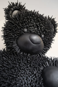 Le generazioni venute al mondo nel nuovo millennio sono ridondantemente etichettate come “nate col telefono in mano”, sottintendendo una capacità innata nel destreggiarsi con i nuovi media tecnologici e una propensione a utilizzare gli stessi con tale facilità da risultare alla pari di un ormai vetusto gioco da tavolo. Queste circostanze tendono a dirigere i bambini verso un isolamento che per gli adulti non è così drastico. L’artista torinese – classe 1985 – fa di questa questione il fulcro del proprio lavoro, con lo scopo di trasmettere, attraverso la scultura, la realtà delle cose, sperando di risvegliare le coscienze di fronte ad un problema che col tempo sta diventando sempre più grande. Dal 13 giugno al 4 luglio 2019, queste sculture cercheranno di dialogare con i cittadini del capoluogo piemontese e con chiunque avrà la curiosità di visitare gli spazi espositivi del Teatro Paesana, in collaborazione con la Galleria davidepaludetto | artecontemporanea e con il castello di Rivara. Le opere esposte riassumono al meglio l’intensità del pensiero di Simone, rivelando una triste verità che vuole scoprire le carte di un gioco ormai da tempo ignorato e assecondato. Simone Benedetto si interroga sul peso reale degli elementi. Alla miniaturizzazione dei processi – immersiva ed infida forma di inserto nella memoria – Benedetto risponde con un gigantismo cavo e una prorompente innocenza da Teddy Bear, che appare più come un Godzilla. Alla facilità con cui è possibile reperire immagini e video dai contenuti violenti o pornografici da parte di bambini e ragazzi, Benedetto oppone i suoi orsetti giganti come guardiani, ma più che icone della difesa essi sono troll, intralcio, ostacoli piazzati davanti all’ingranaggio del flusso informativo divenuto inarrestabile. Sfumatura censoria, nascondimento dell’orizzonte visivo, attivatori di innocenza da vedersi come possibilità/opportunità di non sapere. L’opera di Benedetto, che pur risente di modelli importanti, da Claes Oldenburg a Jeff Koons, Paul McCarthy e Charles Ray su tutti, si manifesta dunque come una possibilità di giocare attraverso la sospensione dello sguardo. Gli elementi sulla pelle – le armi – esauriscono infatti il loro potenziale nel proprio doppio ludico-difensivo: la pelle dell’orso come luogo simbolico del passaggio. Una sintesi dell’essere tradotti nell’età adulta, proposta ad adulti affinché non sia sottaciuta la narrazione generazionale; il tutto all’interno di un processo di selezione che ha continuamente bisogno di immagini grandi per non cedere alla normalità schiacciante delle ‘immaginette’. Sofferta, esemplare, retroattiva: una pelle dell’orso da vendere cara. La serie Together Alone, invece, è qui presentata da un gruppo scultoreo composto da due bambini intenti a fare qualcosa con dei tablet alla mano– sta all’immaginazione del pubblico dedurre cosa sta scorrendo su quegli schermi immobili. Il bambino stante e la bambina seduta rievocano due ricorrenti situazioni in cui oggi è possibile osservare le nuove generazioni, ma quanto è da considerare normale tale immagine? Stereotipare tale condizione si è trasformata in prassi, anche se ai più anziani forse riporterà alla mente i vecchi tempi e le corse in giardino, dove la fantasia era l’unico “medium” a disposizione. L’ultima opera esposta ritrae un bambino-soldato che tiene nella mano destra un’arma da fuoco e nella sinistra, a penzoloni, un orsacchiotto di pezza. Zaino in spalla e cappellino in testa, questa figura sembra lottare interiormente tra un dovere e un piacere. Come l’antico detto recita “Prima il dovere e poi il piacere”, in questo caso viene da dubitare sulla possibilità di applicare tali parole, perché oltre ai doveri esistono anche i diritti e ogni bambino ha il diritto di crescere e di affrontare le tappe della vita secondo il giusto ordine.