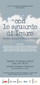 Sabato 15 giugno 2019, alle ore 18.00, presso Palazzo Samone, via Amedeo Rossi 4, Cuneo, verrà inaugurata la mostra “Con lo sguardo di Icaro. Mappe, geografie, percorsi “ degli artisti Giovanni Buoso, Alessia Clema, Christian Costa, Claudio Diatto, Claudio Durando, Tiziano Ettorre, Rebecca Forster, Elio Garis, Guido Giordano, Marco Odello, Corrado Odifreddi, Marco Porta Promosso dalla associazione grandArte, in collaborazione con la casa editrice Primalpe e il settimanale La Guida, l’evento è patrocinato dalla Regione Piemonte, dalla Provincia e dalla Città di Cuneo, e si avvale del contributo della Fondazione CRC.