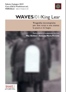 Nel contesto della rassegna SHAKE! il prossimo sabato 8 giugno, presso la Casa d’Arte Viadeimercati di Vercelli (Via Morosone 3), dalle ore 17.00 alle ore 21.00, si terrà “WAVES/0I/King Lear, tragedia incompiuta per due corpi e una stanza: la paura e le bugie”, con performance e installazione di e con Max Bottino e Antonio Maria Porretti. Continuano così le iniziative di Casa d’Arte Viadeimercati con una dimensione culturale sempre più ampia, ricca e diversificata. In questo caso il lavoro teatrale che viene presentato si colloca nell’ambito del progetto ideato da Officina teatrale degli ANACOLETI, in condivisione con l’Assessorato alla Cultura del Comune di Vercelli, che riunisce compagnie teatrali o associazioni di attori vercellesi con lo scopo di coinvolgere il pubblico in un panorama di creazioni e produzioni nate sul territorio che mettano in luce le diverse visioni del “fare teatro” nella loro specificità artistica. Ogni compagnia propone uno spettacolo di propria produzione ispirato all’elaborazione di un testo shakespeariano. Nel teatro shakespeariano le persone si radunavano in una sorta di piazza, dove mangiavano, bevevano e continuavano la loro vita assistendo al dramma. Pochi erano seduti, la maggioranza seguiva in piedi la narrazione, quasi partecipando fisicamente alla storia. Il Teatro era festa “drammatica”, ma anche Carnevale ed Epifania. Le vite reali del pubblico e le vite narrate dai personaggi si mescolavano nella ritualità popolare: il dramma disturbava la vita e il vivere corrompeva il dramma. Vita e narrazione si muovevano all’unisono e trascinavano con sé: verità, finzione, cibo, rumore, vita e poesia. Sul palco: gli attori e nessuna donna. Le madri, le regine, le assassine… le femmine erano maschere: uomini in bilico tra la loro natura e il personaggio.