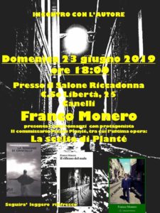 Luci e ombre che si contrappongono nell’atmosfera parigina degli anni del boom economico, luci e ombre che si affrontano nello scontro quotidiano della vita; luci che abbagliano e ombre che salgono in superficie destabilizzando l’opinione pubblica. Nel mezzo, il commissario Planté che si trova in bilico ad affrontare l’orrore collettivo generato da alcune misteriose sparizioni di bambini e lo sgomento per gli attacchi diretti e violenti rivolti al corpo di polizia. Tutti gli agenti della città sono in allerta ma girano, agiscono e si muovono a vuoto, ostaggi bendati di un caso che sembra impossibile da risolvere fino al momento in cui Planté non comprende che l’unica soluzione possibile è usare l’ombra, la stessa nella quale si nasconde il nemico, a proprio vantaggio. Planté non esita e si cala nelle profondità di quell’abisso oscuro. Resterà intrappolato nel buio o riuscirà a risalire a riveder la luce? Venite a scoprirlo Domenica 23 giugno, nel Salone Riccadonna di Corso Libertà, 25 a Canelli alle 18 per l’Incontro con l’autore Franco Monero che presenterà il nuovo romanzo “La scelta di Plantè”e gli altri suoi romanzi con protagonista il Commissario Plantè. L’autore è nato ad Acqui Terme e prende parte alle riprese del film di Guido Chiesa” Il partigiano Johnny”, ma è nella scrittura che trova un nuovo percorso. Così partecipa, con l’inedito “Le verità segrete”, al premio letterario l’Autore indetto dalla Maremmi Editore Firenze, a cui seguirà la pubblicazione da parte della stessa casa editrice.Successivamente pubblica con Seneca Edizioni Torino il suo secondo legal-thriller “Il lato oscuro della luna”.Qualche anno dopo dalla penna dell’autore fuoriesce la figura di Pierre Plantè, ispettore di polizia in una Parigi degli anni ’50, impegnato a risolvere intricati enigmi che lo porteranno a verità sconcertanti, nonché a combattere i fantasmi di un doloroso passato che puntualmente riemergeranno nella sua mente.Così esce “La rondine di cristallo” a cui farà seguito “Il riflesso del male”(entrambi pubblicati con Robin Edizioni), thriller psicologici che tengono incollati i lettori fino all’ultima riga dell’ultima pagina.Con Oakmond Publishing, pubblica lultima opera con l’ennesimo ritorno di Pierre Plantè.
