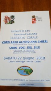 Sabato 22 giugno p.v. alle ore 21.00 nella Chiesa di San Filippo di Chieri, il coro Arco Alpino ANA di Chieri e il coro Voci Del Sile di Quinto di Treviso daranno un concerto intitolato: Incontro di Amicizia. L’ingresso è libero. Sarà una serata diversa oltre che emozionante.
