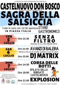 A Castelnuovo don Bosco è di nuovo tempo di…salsiccia: la Pro Loco ripropone infatti, da venerdì 5 luglio a domenica 7, la nona edizione della “Sagra della Salsiccia”, all’insegna della gastronomia, della musica e della competizione.