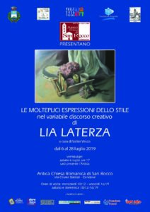 Sabato 6 luglio alle ore 17, gli Amici della Chiesa di San Rocco inaugureranno la mostra di Lia Laterza dal titolo: Le molteplici espressioni dello stile nel variabile discorso creativo di Lia Laterza. L’Artista, coordinata dal curatore Valter Vesco, presenterà circa 30 Opere tra acquerelli, oli e incisioni significativi  della sua importante carriera pittorica.