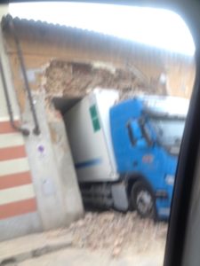 Traffico in tilt di prima mattina a Chieri, in Via Vittorio Emanuele, tra Piazza Europa e Via Roma. Un camion è entrato in retromarcia nel sottopasso che conduce al cortile interno del supermercato Basko ed è rimasto incastrato sotto la volta quando la manovra ha interessato la parte antreriore del mezzo, più alta di quella posteriore. L’autista, anzichè fermarsi subito e chiedere aiuto, ha tentato alcune manovre per sbloccare l’automezzo, con l’unico risultato di far cadere la putrella e destabilizzare il tratto di muro, che è franato sopra il camion. Lunghe e complicate le operazioni per risolvere la situazione (in corso mentre pubblichiamo la notizia) e caos nel traffico di Via Vittorio.