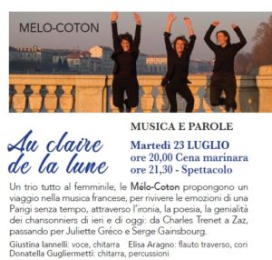 ? ore 21.30 Concerto “Au claire de la Lune” del trio al femminile “Mélo-Coton” (Giustina Iannelli, Elisa Aragno e Donatella Gugliermetti), un viaggio nella musica francese per rivivere le emozioni di una Parigi senza tempo, attraverso l’ironia, la poesia, la genialità dei chansonniers di ieri e di oggi.