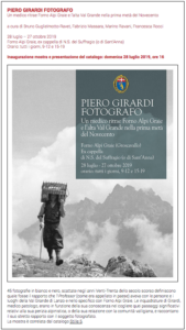 Domenica 28 luglio 2019, ore 16,00 presso Forno Alpi Graie (Groscavallo, TO), ex cappella di N.S. del Suffragio, verrà inaugurata la mostra Piero Girardi fotografo. Un medico ritrae Forno Alpi Graie e l’alta Val Grande nella prima metà del Novecento, cura di Bruno Guglielmotto-Ravet, Fabrizio Massara, Marino Ravani e Francesca Rocci. L’esposizione rimarrà aperta dal 28 luglio al 27 ottobre 2019, tutti i giorni, ore 9,00-12,00 e 15,00-19,00