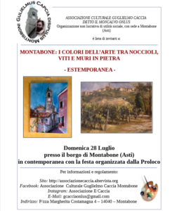 Domenica 28 Luglio ci sarà l’estemporanea di pittura a Montabone (Asti); dedicata sia ai più esperti, sia agli amatori dell’arte.per regolamento e informazioni http://associazionecaccia.altervista.org/regolamento-estemporanea-2019/