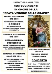 La Chiesa di Valle Ceppi propone, per sabato 7 e domenica 8 settembre 2019, alcuni momenti di preghiera e riflessione in onore della Beata Vergine delle Grazie.