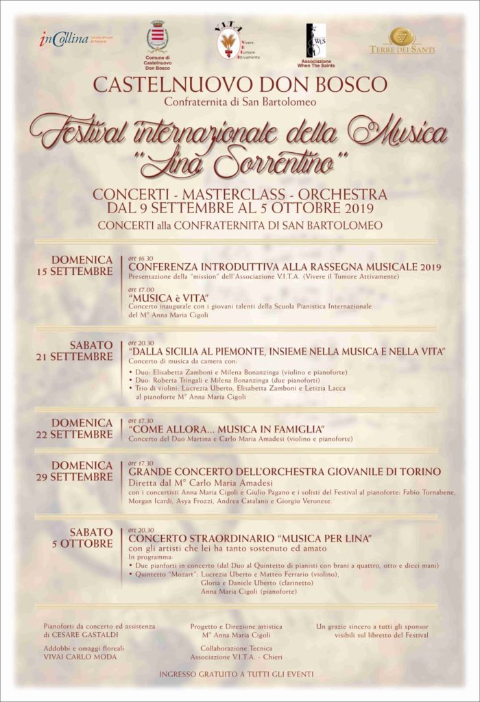 Fino al 5 ottobre si terrà a Castelnuovo Don Bosco un’interessante rassegna musicale, articolata in concerti e masterclass, su progetto e direzione artistica  del M° Anna Maria Cigoli, con la partecipazione dell’orchestra giovanile di Torino (diretta dal M° Carlo Maria Amadesi), di importanti solisti e della nutrita schiera di allievi del M° Cigoli. Cinque concerti, che avranno luogo nella sede della Confraternita di San Bartolomeo, in Via Mercadillo, nel centro storico di Castelnuovo. I pianoforti da concerto e l’assistenza saranno forniti da Cesare Gastaldi; addobbi ed omaggi floreali saranno offerti dai vivai Carlo Moda. Il progetto, sostenuto generosamente dal Comune di Castelnuovo Don Bosco, dall’associazione “When The  Saints” , da aziende e cittadini privati, nasce in sinergia con V.I.T.A., che da anni collabora con il M°Cigoli, che è socia onoraria dell’associazione stessa. Per  V.I.T.A. ODV – Vivere Il Tumore Attivamente è un grande onore poter contribuire alla realizzazione del Festival Internazionale della Musica Lina Sorrentino , perché la musica è una componente preziosa del percorso di vita di una persona: ne affina la sensibilità, l’accompagna nei momenti di gioia e di tristezza, contribuisce alla crescita personale, al ben-essere. V.I.T.A. accoglie donne operate di cancro, le sostiene e le accompagna in un percorso di rinascita dopo la malattia, di ri-motivazione: la cultura, l’arte, la musica sono un ottimo ausilio, a volte una vera scoperta per chi “ricomincia da capo”. Ecco perché non è fuori luogo che un’organizzazione territoriale quale è V.I.T.A. – che ha come mission la prevenzione e la  sensibilizzazione al problema cancro – sia partner e promotrice di questo ambizioso progetto. Lina Sorrentino, alla quale il festival è dedicato, è stata pianista, scrittrice, preside, donna impegnata nel campo del volontariato: negli ultimi anni della sua esistenza ha curato un laboratorio di musico-terapia per le donne dell’associazione. E ha aperto una strada, con la sua cultura e la sua sensibilità. Musica e volontariato in questo progetto stringono un’importante alleanza, resa possibile e favorita dai tanti contributi, sotto forme diverse di solidarietà e di aiuto concreto. Ad ogni concerto verrà distribuito materiale informativo sulla prevenzione e per la tutela della salute.