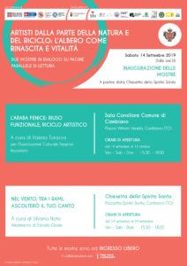Il Comune di Cambiano, nell’ambito di un programma dedicato al riciclo, riuso e sostenibilità, promuove il progetto espositivo ARTISTI DALLA PARTE DELLA NATURA E DEL RICICLO: L’ALBERO COME RINASCITA E VITALITÀ. Due mostre in dialogo su pagine parallele di lettura