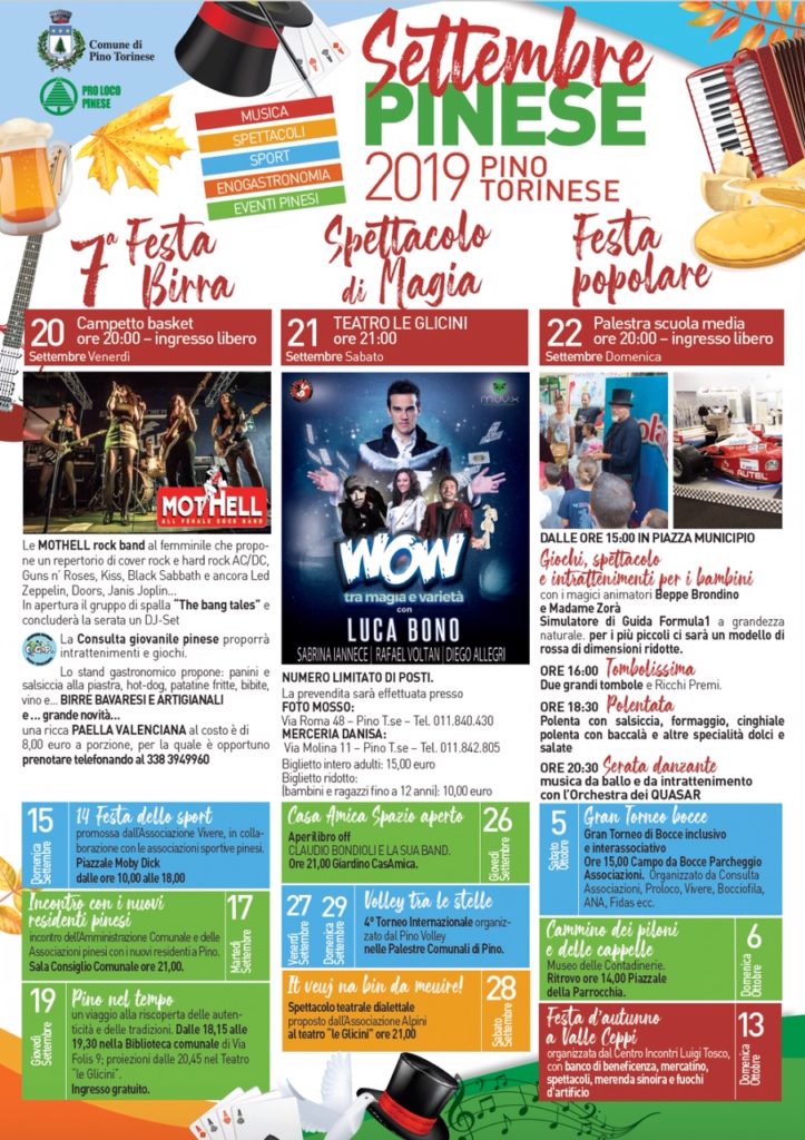 Torna una nuova edizione del “Settembre Pinese”, la rassegna di eventi organizzata dal Comune in collaborazione con la Pro Loco, che si terrà sul territorio il 20, 21 e 22 settembre 2019. Tre giorni di eventi da non perdere, per trascorrere le ultime giornate estive in allegria e condivisione, in compagnia di amici e parenti.