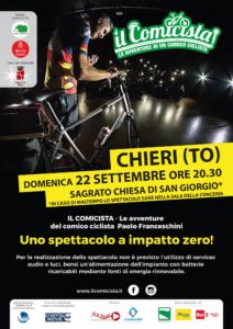 Lo spettacolo “Il comicista. Le avventure di un comico ciclista” va in scena domenica 22 sul sagrato della chiesa di San Giorgio ed è organizzato in collaborazione con Muoviti Chieri. Paolo Franceschini, attore, showman, ex comico di Zelig e Colorado, sale sul palco insieme alla sua compagna di viaggio a due ruote e al suo bagaglio di esperienze, raccolte un po’ pedalando e un po’ viaggiando. Le performance sono pensate per intrattenere, un po’ sorridendo e un po’ riflettendo, mettendo insieme l’ironia e la necessità di ridurre gli sprechi. La musica è trasmessa attraverso una cassa a batteria (ricaricata con energia rinnovabile) e la scena è illuminata dai fari di altre bici parcheggiate a bordo palco, che fungono anche da scenografia. In caso di pioggia o di maltempo lo spettacolo verrà spostato in nella sala Conceria, nei pressi del Municipio. La partecipazione a tutte le iniziative è gratuita.