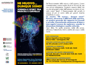La Regione Piemonte, il Comune di Carmagnola e l’Istituto di Istruzione Superiore Baldessano Roccati di Carmagnola, presentano al pubblico la mostra interattiva di Experimenta “Mi muovo…dunque sono!”. L’esposizione, che durerà dal 20 settembre al 31 ottobre 2019, è interamente dedicata al rapporto tra scienza e sport e offre a tutto il pubblico la possibilità di immergersi in una realtà dove la cultura sportiva viene divulgata attraverso installazioni interattive che raccontano i meccanismi che stanno alla base dell’attività motoria e permettono di sperimentare le straordinarie reazioni che il corpo umano è capace di mettere in atto nel corso di un’attività sportiva. La mostra fornisce, attraverso 5 differenti exhibit, un quadro generale del rapporto tra muscoli e cervello, trasmettendo conoscenze di base, ponendo interrogativi su aspetti ancora da esplorare e evidenziando l’importanza dell’attività fisica per la salute del corpo e della mente. Ogni postazione, fra quelle proposte, offre l’occasione ai visitatori di partecipare a sfide pensate per mettere alla prova, attraverso mini gare, i limiti e le abilità di ognuno.
