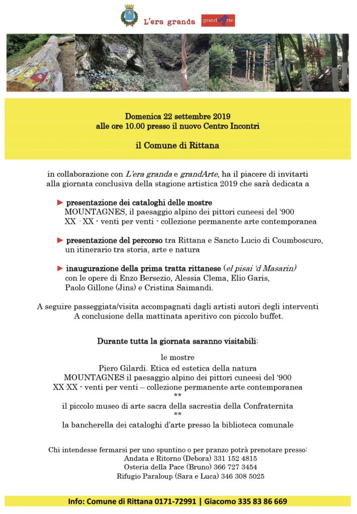 Un’altra giornata speciale dedicata all’arte a Rittana. Domenica 22 settembre 2019 alle ore 10.00: presentazione di due nuovi cataloghi e inaugurazione di un nuovo sentiero tra natura e interventi artistici permanenti.