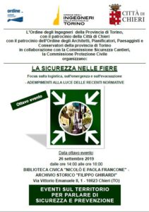 Giovedì 26 settembre 2019, a partire dalle ore 14.00, presso la Biblioteca Civica “Nicolò e Paola Francone” – Archivio Storico “Filippo Ghirardi” (via Vittorio Emanuele II, 1 – Chieri), si terrà il convegno “La sicurezza nelle fiere locali. Focus sulla logistica, sull’emergenza e sull’evacuazione”, organizzato dall’Ordine degli Ingegneri della Provincia di Torino, con il patrocinio della Città di Chieri e dell’Ordine degli Architetti, Pianificatori, Paesaggisti e Conservatori della Provincia di Torino e con la collaborazione delle Commissioni Sicurezza Cantieri e Protezione Civile dell’Ordine.L’evento fa parte di un progetto nato 2 anni fa all’interno della Commissione Sicurezza Cantieri, a seguito di quanto successo in Piazza San Carlo a Torino il 3 giugno 2017.Gli ingegneri della Commissione hanno deciso di approfondire l’argomento e impegnarsi nell’iniziativa, che già a livello embrionale è stata supportata anche dalla Fondazione dell’Ordine. Per affrontare il tema in modo completo ed efficace si è pensato di coinvolgere altre professionalità, come l’Ordine degli Psicologi del Piemonte e la Protezione Civile, grazie alla collaborazione della Commissione Protezione Civile dell’Ordine.Si è voluto fornire un prodotto ordinato e fruibile, dando le giuste indicazioni sulla modalità di gestire la sicurezza durante un evento con presenza di pubblico. Pertanto, si è partiti da definizioni in modo da uniformare il linguaggio tecnico.Tanti gli aspetti affrontati nell’incontro del prossimo 26 settembre: dalle definizioni base alla normativa di riferimento; dalla sicurezza antincendio alle fasi di progettazione, organizzazione e gestione; dalla psicologia dell’emergenza sino ai ruoli della Protezione Civile nell’ambito di un evento.L’ingresso al convegno (erogante 3 CFP per gli iscritti all’ Ordine degli Ingegneri e all’Ordine degli Architetti, PPC della Provincia di Torino, previa iscrizione sul sito http://www.ording.torino.it/agg-professionale/eventi-formativi/icalrepeat.detail/2019/09/26/3093/22%7C16%7C111%7C15/sicurezza-nelle-fiere) è gratuito e aperto a tutti.I crediti formativi sono riconoscibili agli Architetti in autocertificazione sul sistema IMATERIA.La registrazione dei partecipanti inizierà alle ore 13.45Ufficio Stampa Ordine degli Ingegneri della Provincia di TorinoDaniele Milano danielemilano@alice.it 328.2913804