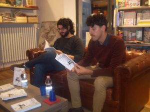 Per l’occasione nell’ accogliente salotto della libreria di Bea nel cuore di Nizza c’è stata una descrizione della nascita della collaborazione fino alla realizzazione concreta del volume. Gli autori hanno intrattenuto i presenti con una piccola presentazione del libro e una lettura delle poesie ed è il primo lavoro a quattro mani di questi due giovani nicesi che hanno deciso di condividere questa loro opera in questa nuova realtà della loro cittadina e quando è uscita due anni fa l’avevano già esposta presso i locali della Biblioteca Civica “Umberto Eco”.Dopo aver visto un’illustrazione di Gabriele, Mattia ha deciso di contattarlo per l’idea di copertina e aveva in mente di basare su giochi di luci/ombre e bianco/nero. Gabriele si è catapultato così nel magico mondo di Mattia e ha provato ad illustrare le sue parole e dalla copertina, si è passati a 12 illustrazioni e il fatto di appoggiare questa raccolta a qualcosa di visivo, lo appassionava e cosi è nata questa bella collaborazione, raccogliendo le loro forze in questa nuova avventura editoriale. Queste 37 poesie, piu l’intro è una sorta di diario, nato dal bisogno di tirare fuoiri i pensieri e i disegni sono in bianco/nero per rimando a quest’atmosfera noir, in un viaggio interiore alla ricerca di un io, del lato oscuro dentro di noi che non conosciamo.Il titolo è dettato dalla nostra ombra che volenti e nolenti ci viene sempre dietro e cerca di comunicare con noi.Le illustrazioni sono un arricchimento alle poesie e nascono da due punti di vista diversi, ma con lo stesso tema, dettate in due chiavi di lettura diverse. .