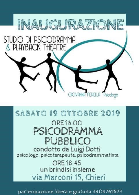 Lo Studio di “Psicodramma & Playback Theatre” è una nuova esperienza nella quale è coinvolta la nostra concittadina Giovanna Ferella. L’evento di inaugurazione si svolge a Chieri sabato 19 ottobre alle h. 16,00 in via Marconi 15.