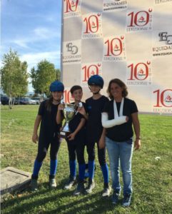 Domenica 12 ottobre 2019 le squadre dell’Equestrian Chieri hanno vinto per il secondo anno consecutivo il prestigioso Trofeo Quattro Regioni – Challenge Pony-Mounted Games 2019 -Fise- nella disciplina del Pony Games. In questa attività il rapporto pony – cavaliere è molto importante, tra i due deve instaurarsi una comprensione reciproca. Ogni violenza verbale o fisica è dunque esclusa, sperone e frustino sono vietati, così solo con un giusto equilibrio fra il pony ed il cavaliere si può ottenere un buon risultato. Al primo posto – medaglia d’oro categoria C3 qualificante – Rebecca Romano, Caterina Maria Bodrato e Giacomo Fontana seguite dall’istruttrice Maria Andreace, dopo le tappe di Sommacampagna( Verona), Cavaglià (Biella), Cervia (Ravenna ) e Montefalco (Perugia ), hanno portato a casa il prestigioso trofeo sbaragliando la concorrenza di altre 17 squadre. Grazie ad una sequenza di due vittorie e un secondo posto i ragazzi si sono presentati già prime alla tappa conclusiva, che tuttavia hanno vinto di misura dopo un week-end di gare tiratissime. Le squadre del centro ippico ASD Equestrian Chieri, partecipano costantemente a gare di livello nazionale e ancora una volta hanno fatto centro, mantenendo nella nostra città per il secondo anno consecutivo questo trofeo di rilevanza nazionale. Il prossimo anno l’obiettivo della squadra sarà di partecipare ai campionati categoria Elite in Italia e ai campionati d’Europa Mounted Games.