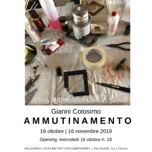 Il 16 ottobre 2019, negli spazi di Riccardo Costantini Contemporary a Torino, si è inaugurata la mostra personale di Gianni Colosimo “Ammutinamento”. Colosimo è considerato uno degli artisti di punta dell’area torinese e ha conseguito con la propria ricerca artistica una significativa notorietà internazionale. Celeberrima la sua mostra “Wallpaper: Il vortice del desiderio è privo d’orizzonte”, realizzata nel 2006, in cui utilizzò centomila banconote da un dollaro per tappezzare completamente la galleria Pack di Milano. Il progetto di Ammutinamento è sintesi e epilogo di un ciclo di mostre dove Colosimo espone opere caratterizzate da autonomia vitale ed estetica che si affrancano dall’autore, dal pubblico e dall’attuale sistema dell’arte: opere ‘ribelli’ che non vogliono sottostare al giogo del ruolo che l’autore-artista gli impone. In “Ammutinamento” il gesto della ribellione viene portato alle sue estreme conseguenze: con una coralità epica, le opere esposte manifestano la loro volontà iconoclasta. Con la loro presenza espongono il proprio rifiuto ad aderire alla dittatura delle immagini. Quale metafora estrema, “Ammutinamento” segna un punto di rottura nel mondo dell’arte. L’assenza, il non esserci, diventano per Colosimo l’essenza di un atteggiamento che marca la propria volontà di non adesione e di rifiuto della vuota spettacolazione babelica della nostra esistenza. La realizzazione del progetto di mostra è in collaborazione con Luisa Bruni.
