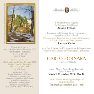 L’Assessorato del Turismo, Sport, Commercio, Agricoltura e Beni culturali della Regione autonoma Valle d’Aosta comunica che, venerdì 25 ottobre 2019, alle ore 18, al Museo Archeologico Regionale di Aosta, verrà inaugurata la mostra Carlo Fornara e il Divisionismo. L’esposizione, curata da Annie-Paule Quinsac e diretta da Daria Jorioz, presenta nelle sale del Museo Archeologico Regionale un ricco percorso espositivo di 80 opere tra dipinti, disegni e grafiche.