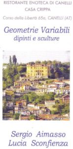Il 19 0ttobre si è inaugurata la terza mostra di quadri e sculture tra le colline del Monferrato di Lucia Sconfienza e Sergio Aimasso. Questo grazie all’instancabile attività organizzativa della direttrice del Museo di Arte contemporanea di Mombercelli (AT) Anna Virando. L’evento avverrà nei locali dell’enoteca-ristorante Casa Crippa di Canelli (AT). Il titolo “Geometrie variabili” vuol rappresentare il continuo indagare tra le geometrie della forma nel divenire dell’opera, realizzando dimensioni probabili ma anche improbabili. Gioco oscillante tra l’astratto e il figurativo nella costruzione di segni che vogliono suggerire anche impressioni trasfigurate tra forme ed emozioni. La ricerca degli autori è il tentativo di dare corpo ad un nuovo immaginario.