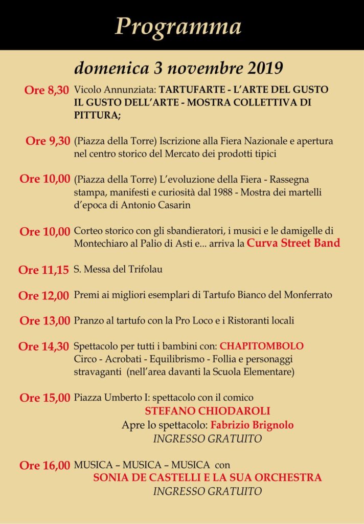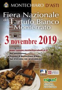 Ogni anno di questi tempi, come per magia un’intera comunità si ritrova attorno alla propria Fiera nazionale del tartufo bianco del monferrato, in programma il 3 novembre, evento più rappresentativo dell’anno, ma rappresenta molto di più: è diventata il fulcro aggregante di una comunità attorno a Re Tartufo. Montechiaro chiama a raccolta tutti gli amanti del tartufo nella suggestiva piazza del municipio, per l’occasione coperta da maxi padiglione, si potranno vedere gli esemplari di tartufi in concorso a suon di musica della Curva Street Band ed esibizione degli sbandieratori e musici di Montechiaro, nel paese dalla tartufaia “il grande bosco” una delle più grandi d’Italia. Nella giornata della fiera il prezioso tubero, sarà cucinato dall’esperienza nella preparazione del menù a base di tartufo dalla pro loco e ristoranti locali che esalteranno il prodotto dal sapore e profumo inconfondibile, tutti gli aromi del grande bosco, un vero è proprio paradiso naturalistico a due passi dalla chiesetta romanica di s. Nazario e la pieve romanica di Pisenzana, un viaggio emozionante nel romanico e dell’arte del gusto e il gusto dell’arte in vicolo Annunziata “en plein air” ed al chiuso nella sede del comitato palio a cui hanno già aderito i seguenti artisti: Alfio Amadio, Germana Albertone, Alessandra Ardizzone, Tata Ardagna, Giacomo Barletta, Elena Bellaviti, Elisa Bernardo, Claudio Bertagna, Armanda Bertolina, Domenico Binello, Donata Bonazzi, Silvia Borello Lenta, Marina Bottero, Pasquale Bucci, Raimondo Carretta, Maria Antonietto Claretto, Giuseppe Colli, Giuseppe De Angelis, Raffaella Di Benedetto, Carmelo Fusolini, Valter Ghio, Carlo Alberto Longaretti, Alberto Lovisi, Antonio Lupo, Francesca Lupacanto, Pietro Macchiolo, Giuseppe Maio, Olga Manganiello, Barbara Martini, Emma Massa, Rosalba Masone Beltrame, Nino Melloni, Lorenzo Meneghel, Italo Medda, Gerlando Meli, Antonella Murgia, Federico Olivero, Cesare Oneda, Mario Pavone, Giovanni Petrucci, Crissi Piras, Paola Pozzo, Giovanni Rapicano, Lorenzo Ravera, Rossella Rossi Forza, Raffaella Santi, Eugenio Santoro, Sonia Simoneschi, Daniele Soccol, Ermanno Sommi, Giuliano Tacite, Mauro Ugazio, Vittorio Zitti, Angelo Zuffinetti. In piazza, di fronte al padiglione della fiera l’evoluzione della fiera da comunale, regionale a nazionale: tagli, ritagli e travagli fieristici dal 1988 – rassegna stampa con aggiornamenti all’ultima edizione e mostra del martello d’epoca a cura di Antonio Casarin, una rivisitazione dei martelli usati un tempo dal ciabattino, fabbro, falegname, muratore ecc. più di 700 esemplari di martelli per svariati usi di un’epoca ormai d’antan. Nel pomeriggio spettacolo per i bimbi di Chapitombolo, indi spettacolo comico con Stefano Chiodaroli, presenta Fabrizio Brignolo. In chiusura musica, musica con Sonia De Castelli e la sua orchestra.
