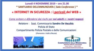 Lunedì 4 Novembre alle ore 21 nella sede della Confraternita della Misericordia, Piazza Trieste n. 1, Sandro De Vecchis, Commissario della Polizia Postale – Piemonte e Valle d’Aosta, spiegherà come usare Internet con consapevolezza: un aiuto per noi, i nostri figli e nipoti.